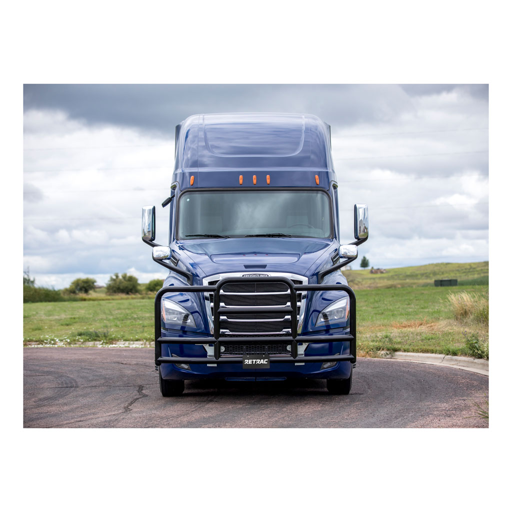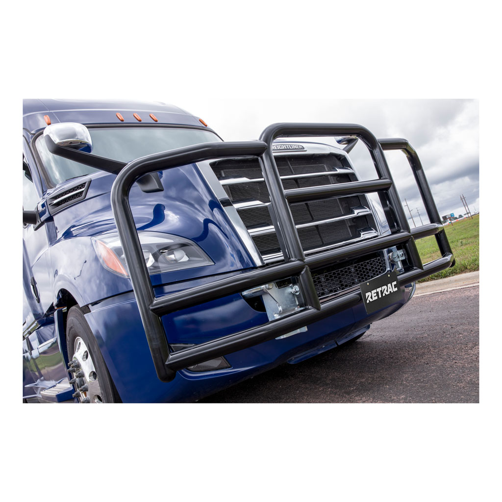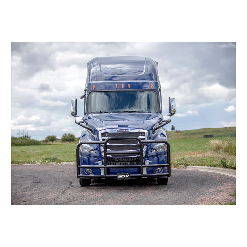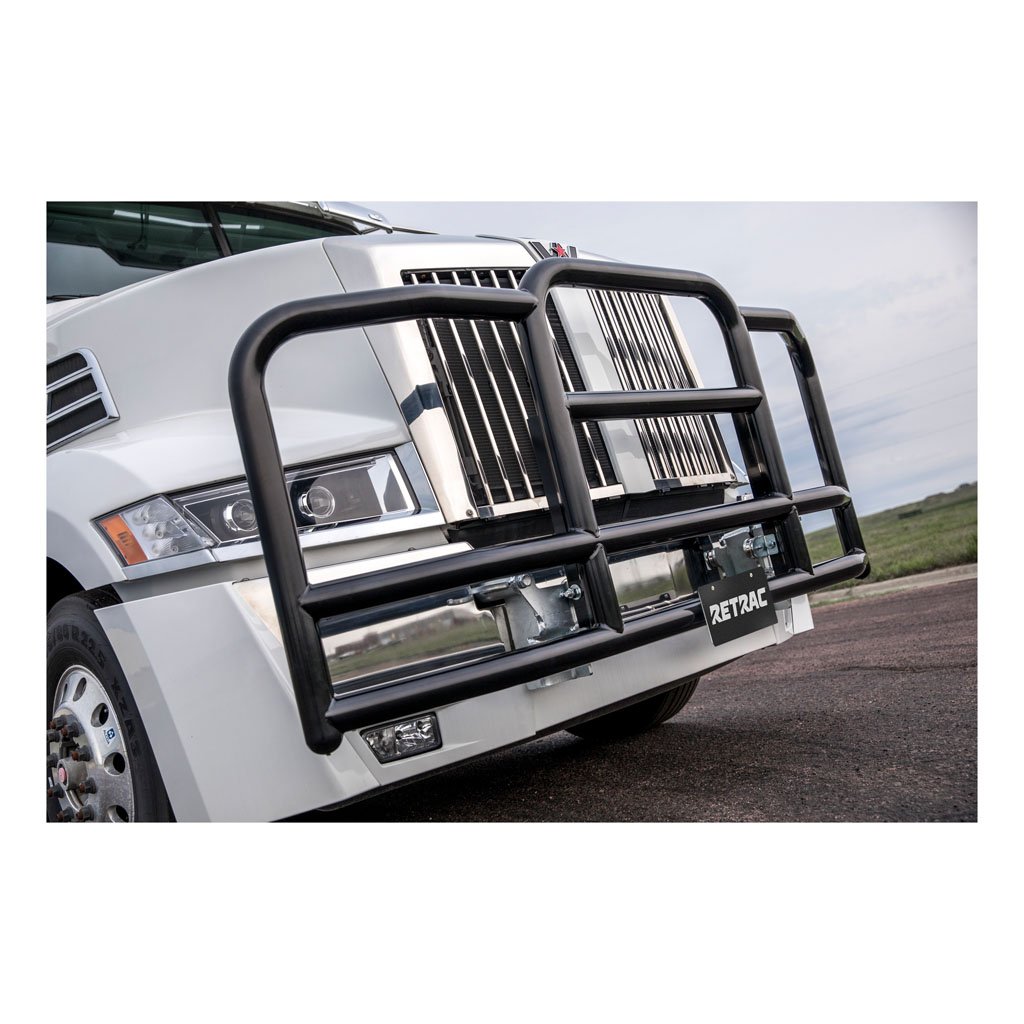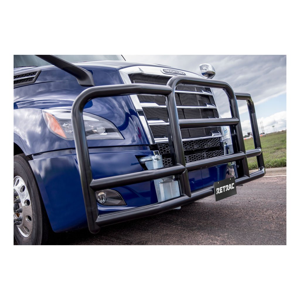The RETRAC ProTec™ grille guard offers dependable protection for the front end of your semi or other heavy-duty truck and provides that professional, finished look you demand. It features 3" diameter tubing, welded together into a one-piece layout.