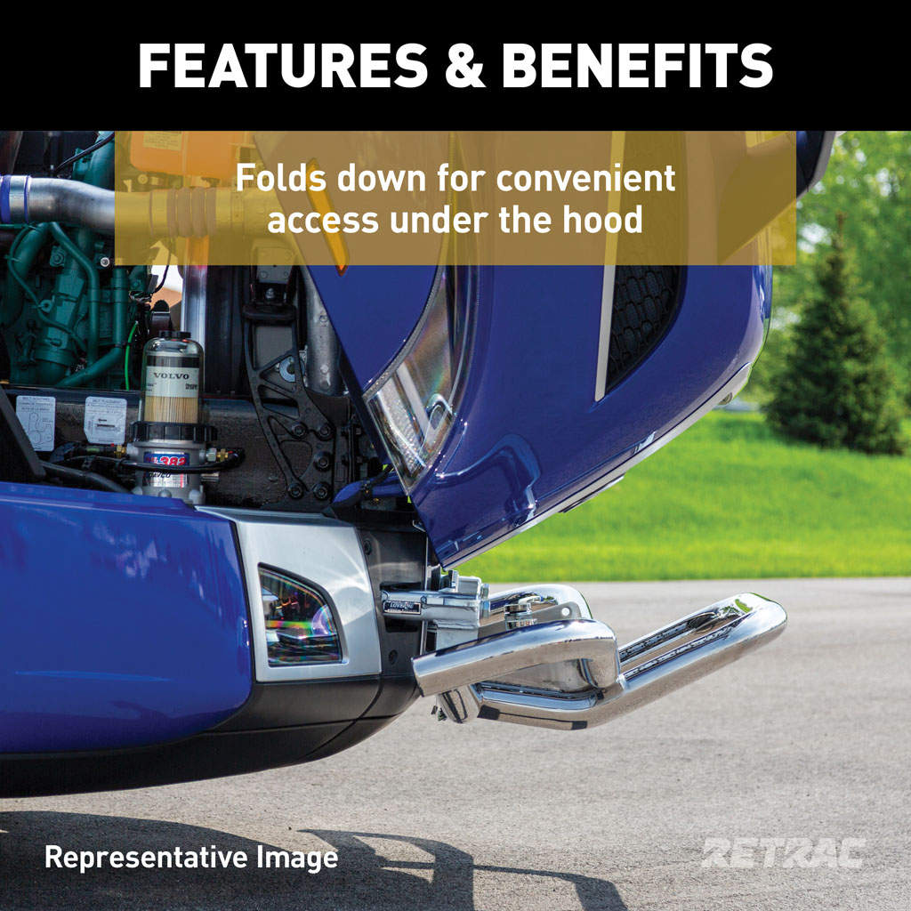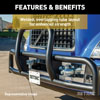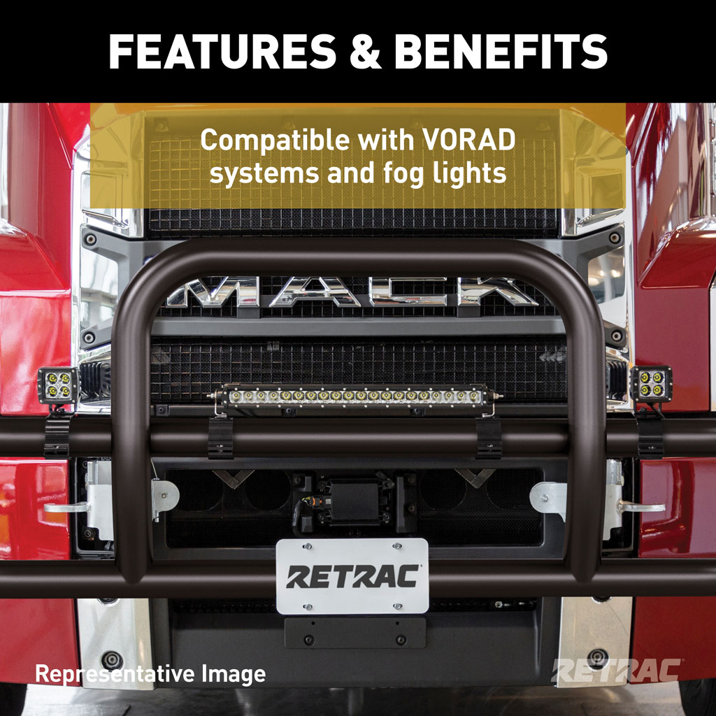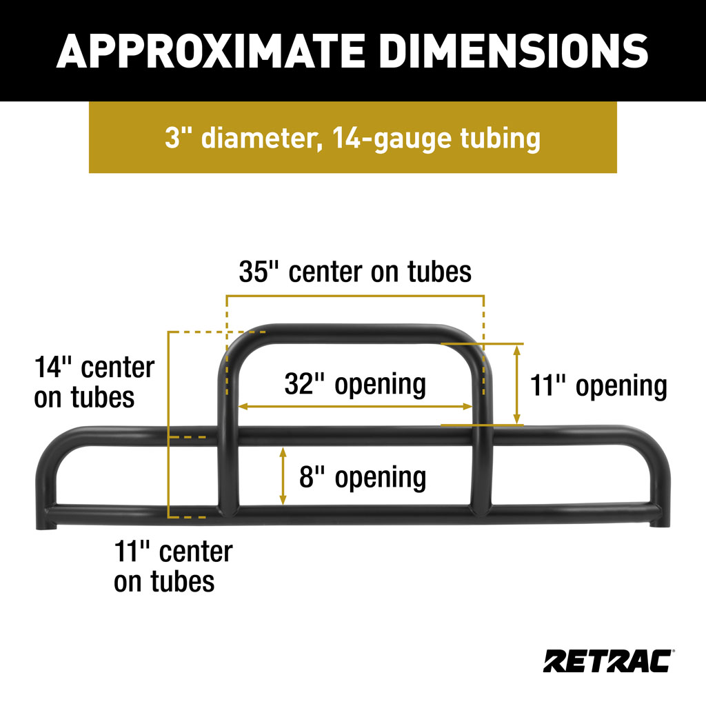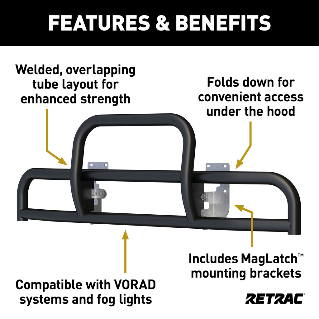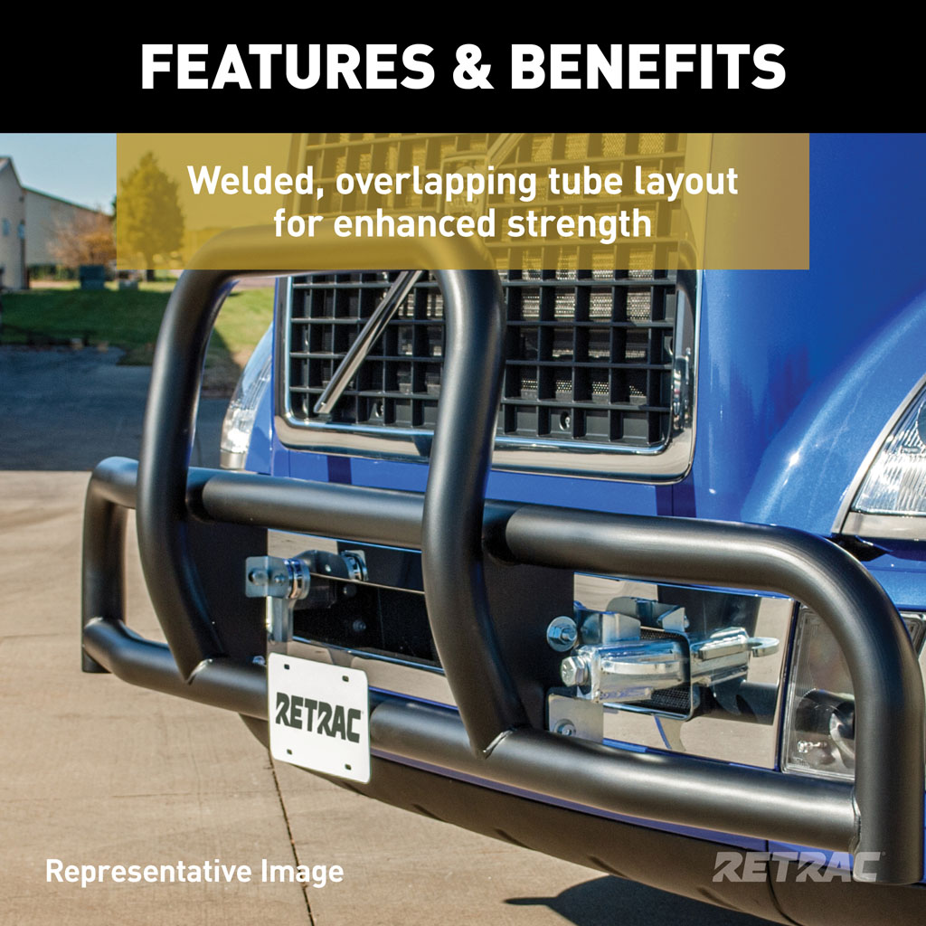 When you have miles to cover and a job to do, you need front-end protection that not only adds strength but also has a professional look to match your business. The RETRAC Tuff Guard® II features reinforced strength with an overlapping, 14-gauge tube design. To make sure each grille guard is built to last, we construct it from stainless steel. This particular model features a black powder coat finish for maximum corrosion resistance, and it is also available in a polished finish.