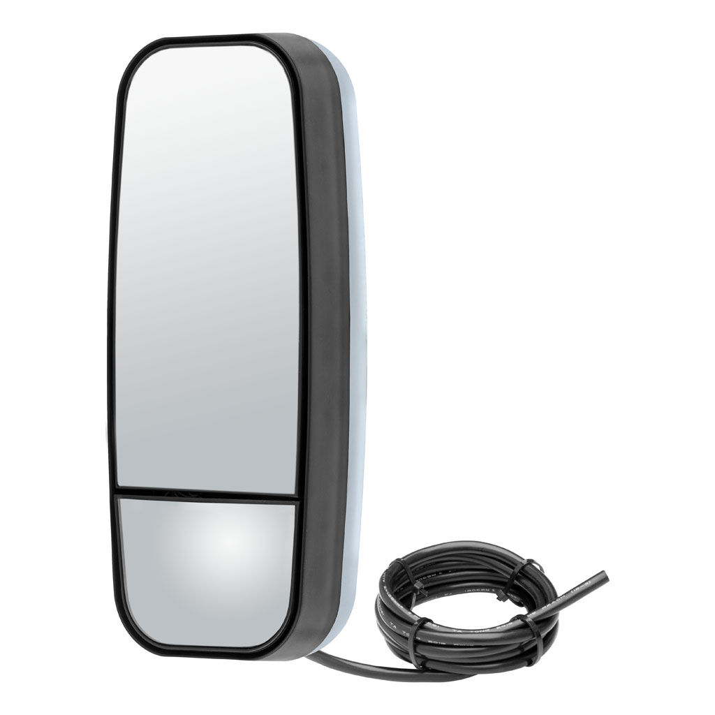 This adjustable aerodynamic mirror installs with a universal clamp to fit any 3/4" to 1-1/4" diameter loop. It offers a dual view for maximum blind spot coverage, with flat glass on top and a convex mirror on the bottom. It also has manually adjustable glass that can be angled vertically and horizontally as needed. For both the top and bottom, this adjustable mirror has first-surface, electro-chrome glass for maximum safety, and it features a smart, self-regulating heater that keeps the glass free of frost with no switch or monitoring by the driver required.