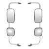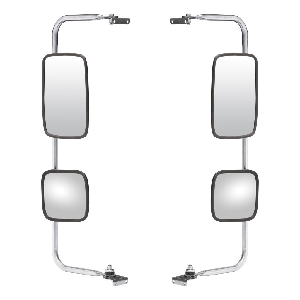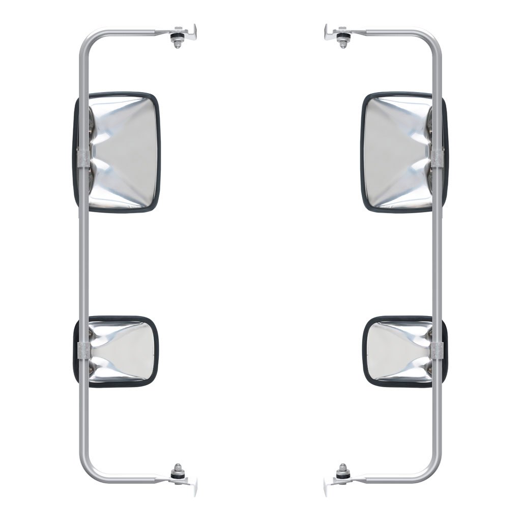 The top mirror heads feature 6-1/2" x 10" flat glass, while the bottom mirror heads feature 6-1/2" x 6" convex glass for a clear view of blind spots. Both have non-glare, first-surface glass and are constructed from polished stainless steel. The mirror assemblies are equipped with our patented retractable mechanism for as-needed clearance, and they are vertically adjustable for custom positioning.