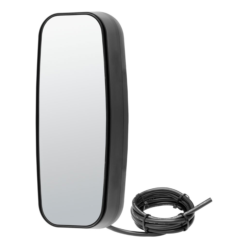 This motorized aerodynamic mirror installs with a universal clamp to fit any 3/4" to 1-1/4" diameter loop. It provides an adjustable 8" x 19" view with a four-way actuator that angles the glass vertically and horizontally with a simple touch control (switch not included). This power mirror also has first-surface, electro-chrome glass for maximum safety, and it features a smart, self-regulating heater that keeps the glass free of frost with no switch or monitoring by the driver required.
