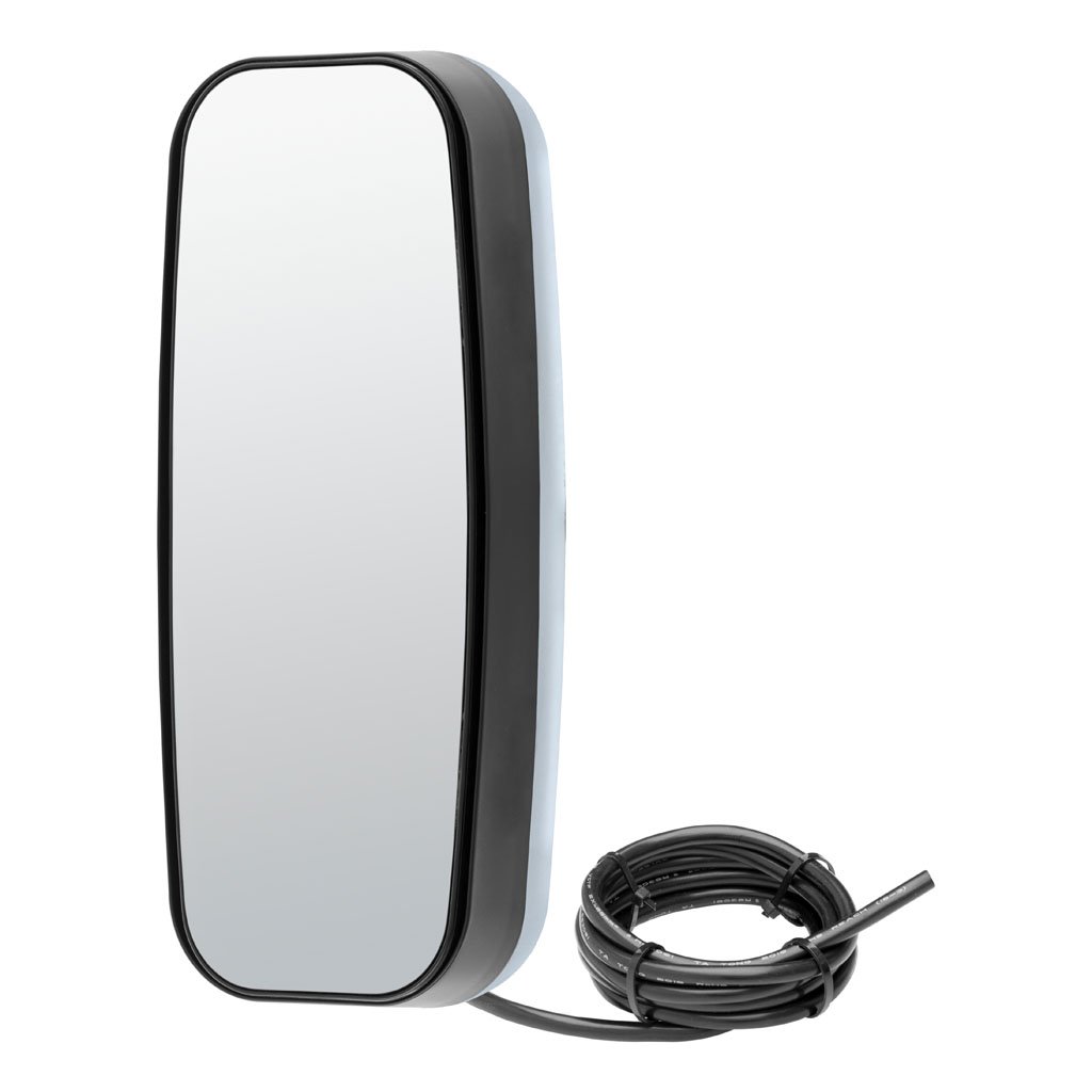 This adjustable aerodynamic mirror installs with a universal clamp to fit any 3/4" to 1-1/4" diameter loop. It provides an 8" x 19" view that can be manually adjusted and angled vertically or horizontally. It also has an integrated marker light and first-surface, electro-chrome glass for maximum safety. It features a smart, self-regulating heater that keeps the glass free of frost with no switch or monitoring by the driver required.